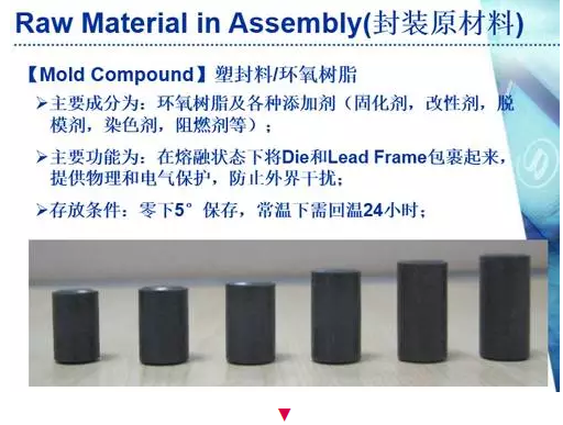 ➢EMC (塑封料)为黑色块状,低温存储,使用前需先回温。其物性为:在高温下先处于熔融状态,然后会逐渐硬化,最终成型。