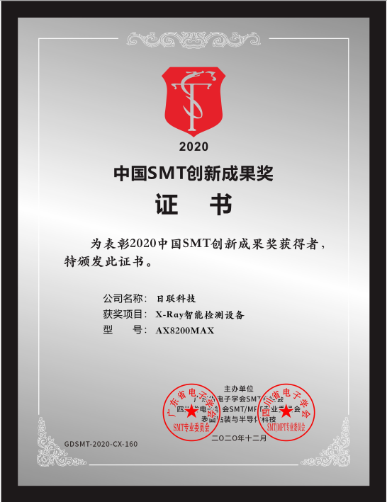 第十六届中国华南SMT学术与应用技术年会于2020年12月18日在深圳成功举办,同期举行的“2020中国SMT创新成果奖”颁奖典礼上,日联科技代表荣耀登台受奖,该奖项旨在表彰企业在SMT设备及物料的技术提升、科技创新、产品研发等方面做出的杰出贡献。