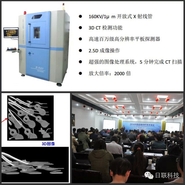作为电子制造业X射线智能检测装备领航者,日联科技受邀参会,西北片区经理刘岚发表题为《X射线3D 智能检测技术》之专题报告。众所周知,随着电子产品集成度越来越高、元器件的封装越来越小、且在板上的分布密度愈来愈密,其生产加工工艺变得愈加复杂,焊接质量的保障迎来新的挑战,加之传统的表面光学检查及ICT测试都有各自的检测盲区,因此具有穿透检测功能的X光检查作为电子产品质量检测必不可少的关键技术就显得尤为重要。特别是当今智能电子产品上广泛使用的PoP叠层封装焊接质量检测,具有3D CT功能的X射线智能装备就大显神通了。报告中重点介绍X射线的激发/成像原理、三维CT技术的检测优势、以及结合日联科技**研发的国内首台160KV/1μm微聚焦3D CTX-ray机器AX3000的智能检测技术及优越的软件性能给听众进行一一报告。为广大电子制造企业提供工艺优化和质量提升的新技术和新方案,受到现场嘉宾的广泛关注。