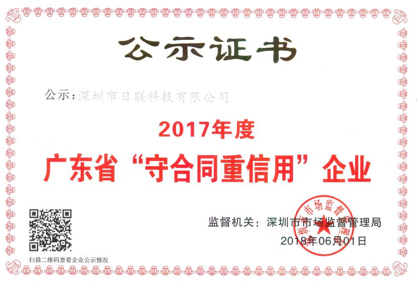 近日,广东省工商行政管理局发布关于2017年度 “广东省守合同重信用企业”的公告,日联科技凭借十多年来的积累与信誉,再度荣获“守合同重信用企业”这一荣誉称号。